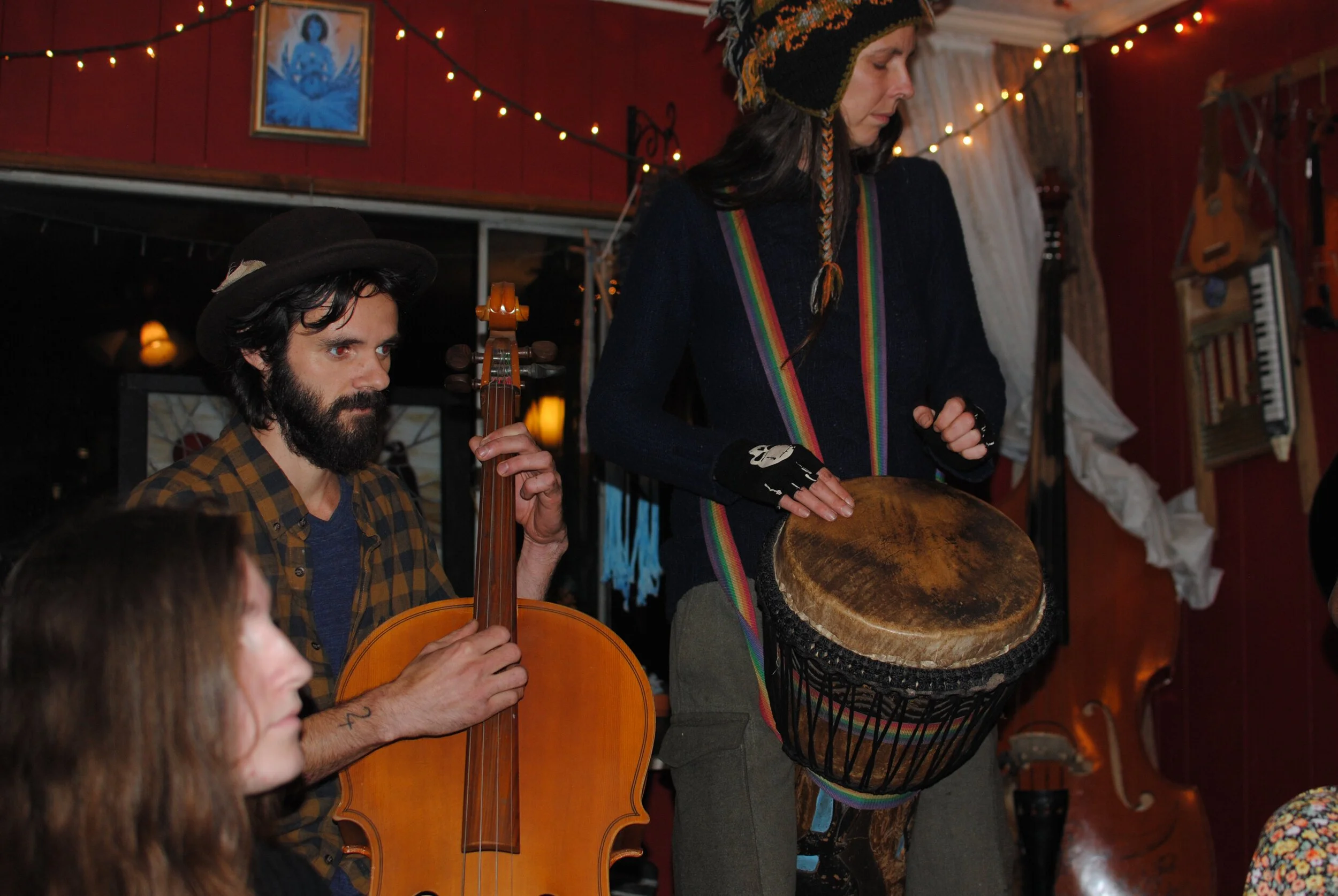 So my precious friend Hannah opened up the night as Chickadee singing some truly wondrous songs. She was backed up by multiple folks from The Hills and The Rivers, a street folk family band, making some fantastic, alluring music (find them at thehillsandtherivers.com and check out their new album on bandcamp here). One of the most important things Hannah has taught me is how to feel the world around me as thick and full of things to see, notice, wonder, ponder, celebrate, draw, sing about, dance around, climb up, etc. etc. She is a person who looks to see not just what’s in front of her but what’s growing under her feet, what’s flying by and what is mysteriously coming to her inner child and jaded adult spirit… and how it all swirls together. I have never spent time with my dear friend without feeling truly inspired by her way of being in the world. I really don’t know how to describe the depths and breadth of Hannah’s writing (I am such a fangirl of hers) but I can describe her melodies as whimsical, meandering and pleasingly melodic without being boring or predictable.